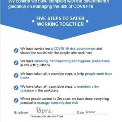 Please view the poster which confirms we have complied with the government’s guidance on managing the risk of Covid-19 and outlines the 5 steps to safer working together.